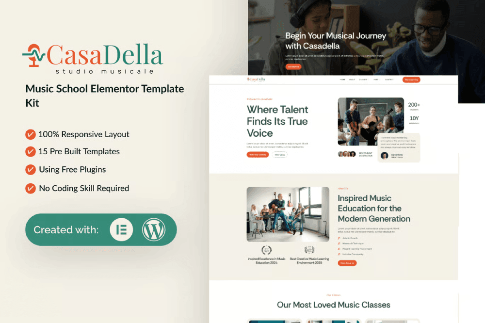 CasaDella is a professionally designed Elementor Template Kit for music schools, tutors and academies. It includes responsive course pages, teacher profiles, event layouts, booking-ready templates and SEO-friendly structure. Fast, customizable and Elementor Pro friendly, CasaDella helps you showcase lessons, manage enrollments and promote recitals with beautiful, conversion-focused layouts — perfect for educators who want a polished website without coding.