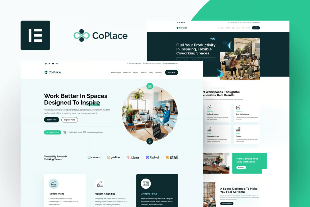 CoPlace is a polished Elementor Template Kit for coworking spaces and shared offices. It includes responsive templates for home, pricing, space tours, events, bookings, and blog pages. With customizable hero blocks, pricing tables, booking-ready layouts, and global style controls, CoPlace helps you launch a professional site quickly and convert visitors into members with optimized CTAs and streamlined UX.