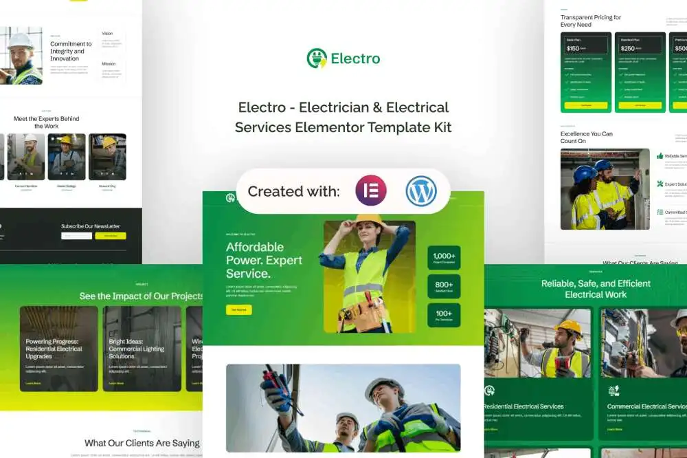 Electro: Elementor Template Kit for Electricians & Electrical Services is a modern, customizable kit for creating a professional website. Includes 16 pages, fully responsive design, and no coding required. Perfect for electricians and service providers.
