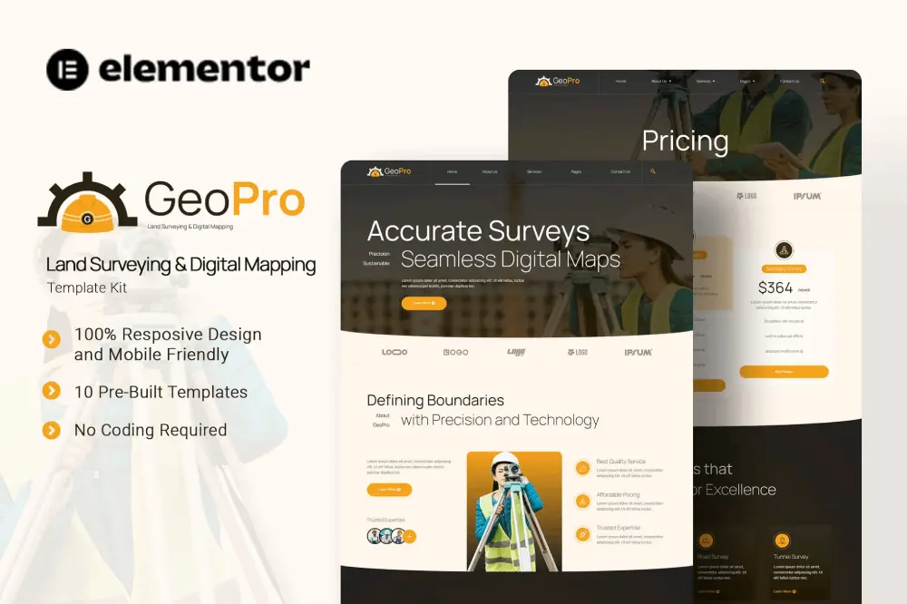 Geopro – Elementor Template Kit for Land Surveying & Digital Mapping. Build professional websites with 10+ pre-built templates, optimized for performance, and no coding required!