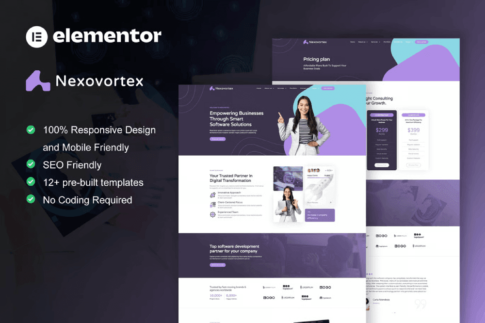 Nexovortex 6 Software Company Elementor Pro Template Kit Nexovortex is a premium, ready-made Elementor Pro template kit crafted to accelerate the launch of modern software, SaaS, and tech-agency websites. Built with conversion-focused layouts, modular sections, and customizable global styles, Nexovortex helps teams deliver a polished online presence in hours rather than weeks. It combines persuasive pricing and features blocks, clear product storytelling, client showcases, and a developer-friendly structure that integrates seamlessly with Elementor Pro widgets, Theme Builder and popular marketing plugins. Every template is responsive, lightweight, and optimized for speed and accessibility to perform on any device and improve search visibility.