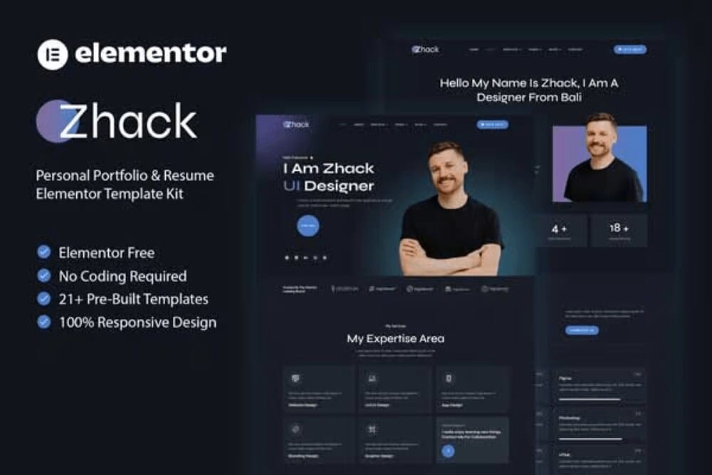 Zhack: Elementor Template Kit for Personal Portfolio & Resume Websites offers a modern design with 21+ ready-to-use templates. No coding is required, making it ideal for freelancers and creative professionals looking to showcase their work.